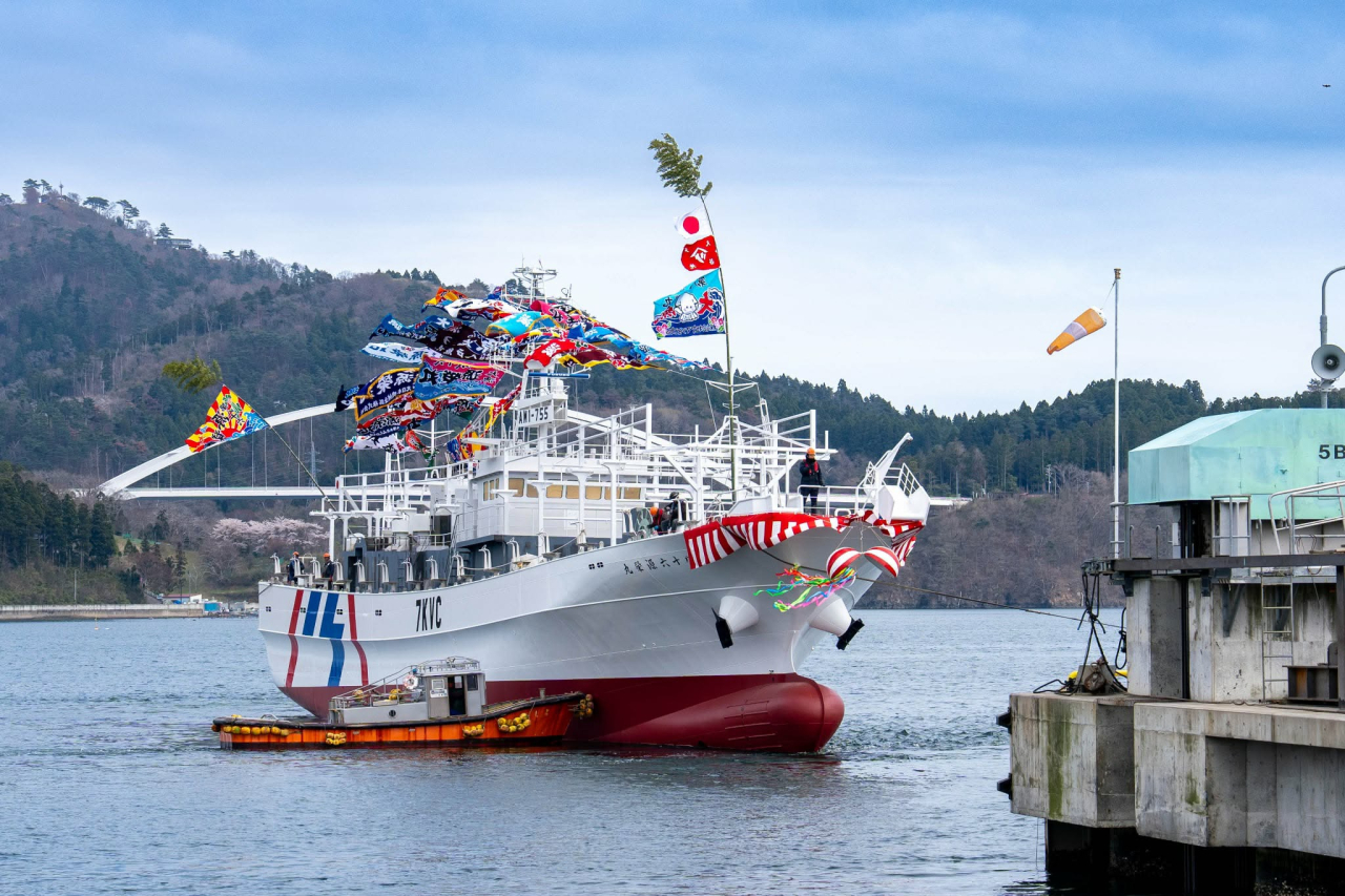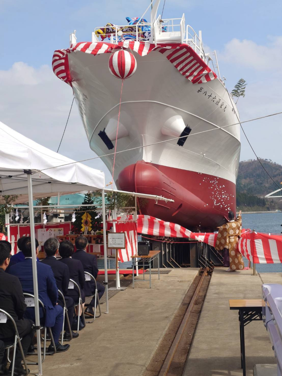 気仙沼市にある、株式会社みらい造船様造船所にて第86源榮丸の進水式を行いました。その日はとても天気が良く、皆さまから頂いた鮮やかな大漁旗を掲げ、勇ましく着水しました。まだ完成ではございません、皆さまへのお披露目までもう少しお待ちください‼
