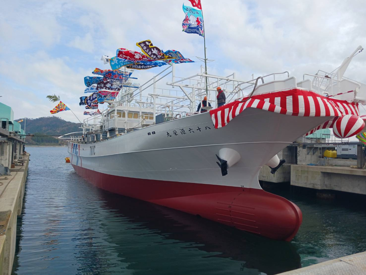 無事着水!中型いか釣り船としては、全長が従来より1.4倍ほど大きくなりました。船員の居住スペースでは寝室が全個室となりプライベートも充実。トレーニングルームもあります。